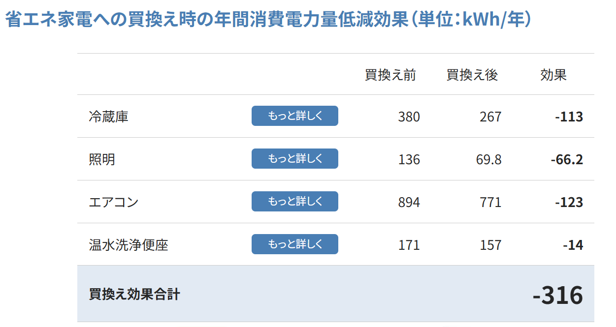 ※冷蔵庫・エアコン・温水洗浄便座は2014年の製品から2024年製の省エネタイプに買換えた場合、照明は蛍光灯シーリングライト(68W)からLEDシーリングライト(34W)に買い換えた場合と想定