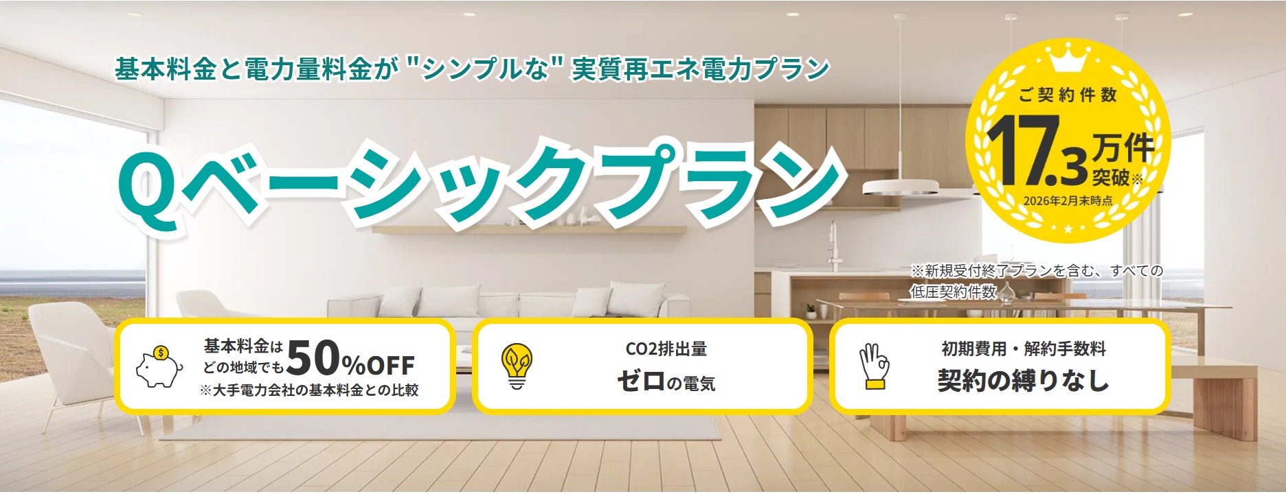 本プランは、地域の大手電力会社と比較して基本料金を50%OFFに設定し、さらに使用する電気を実質再生可能エネルギー100%(CO2排出量ゼロ)※1とすることで、家計への負担軽減と環境保護の両立を実現します。